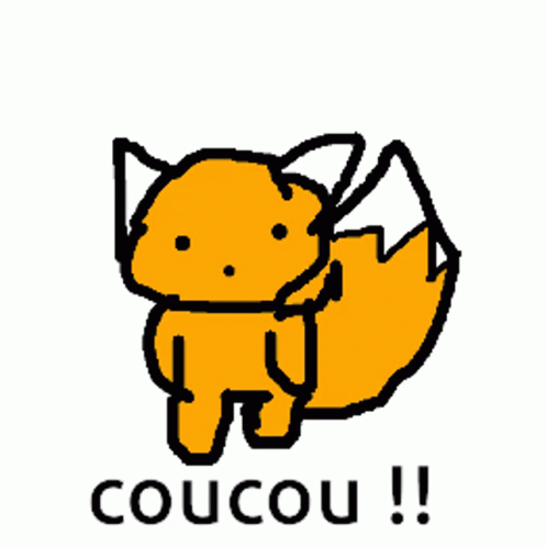 A cute, hand-drawn orange fox waves its paw and says 'coucou' (hello).