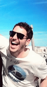 Miguel Angel Silvestre and Frank Jurado laughing happily, wearing sunglasses and a white shirt with a skull design.