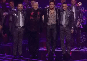 Miguel Bose and La Banda El Recodo bow and thank the audience after a performance, saying 'Gracias!'.