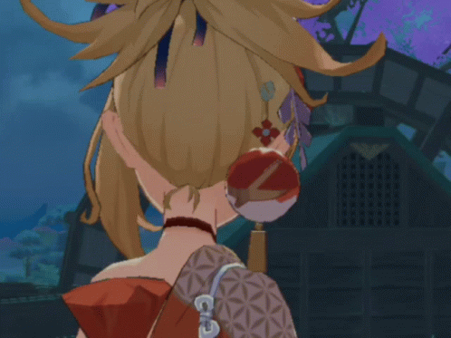 Yoimiya from Genshin Impact smiles and winks, showing her flower tattoo and butterfly necklace.