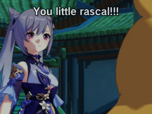 Keqing from Genshin Impact scolds Guoba, who looks confused with question marks appearing.