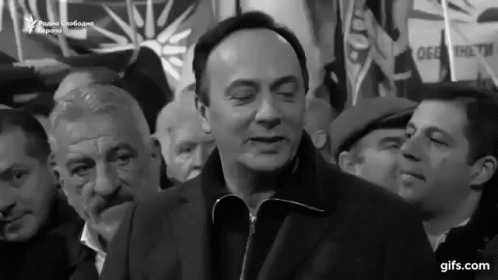 Saso Mijalkov smiles and covers his mouth while surrounded by a crowd of people.