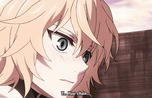 Mikaela Hyakuya from Owari No Seraph shows a shy, flustered expression while calling out to Yuu-chan.
