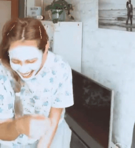 Mikeandmery laughs joyfully while wearing a white face mask, enjoying a moment at home.
