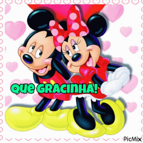 Mickey Mouse and Minnie Mouse share a sweet moment with the message 'Que Gracinha!' (How Cute!).