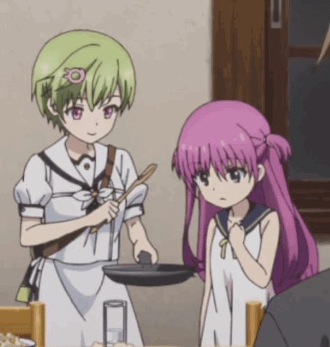 a girl with green hair is holding a frying pan next to a girl with purple hair