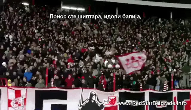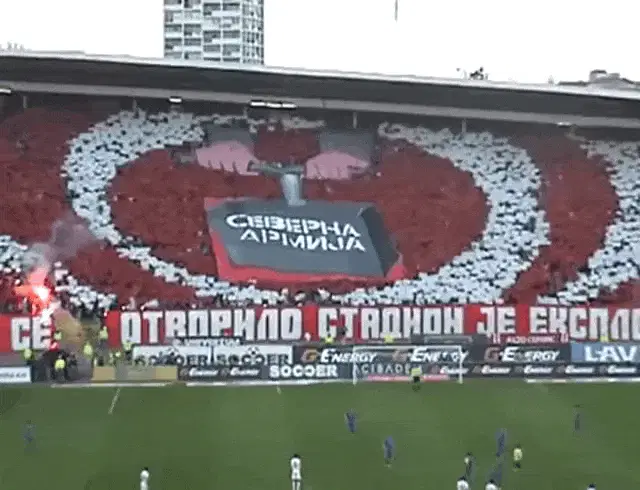 Milan Pavkov celebrates a goal for FK Crvena Zvezda with teammates in a stadium.
