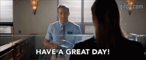 A man in a blue shirt and tie smiles and says "Have a great day!" to a woman.