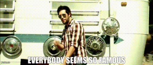 Miley Cyrus and others in a montage with the phrase 'Everybody Seems So Famous' overlaid.