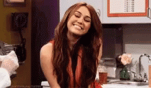 Miley Cyrus as Hannah Montana smiles and winks playfully, showing her cheerful demeanor.