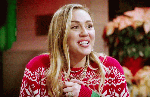 Miley Cyrus smiles brightly, wearing a festive red and white Christmas sweater with her hands clasped.