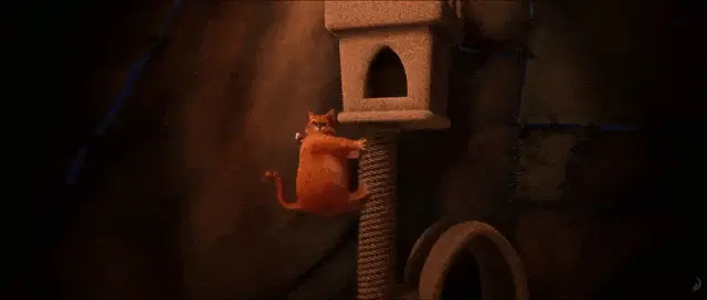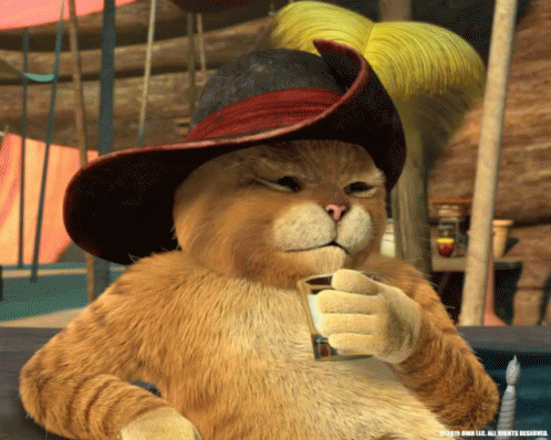 Puss in Boots, wearing his signature hat, relaxes while enjoying a refreshing drink of milk.