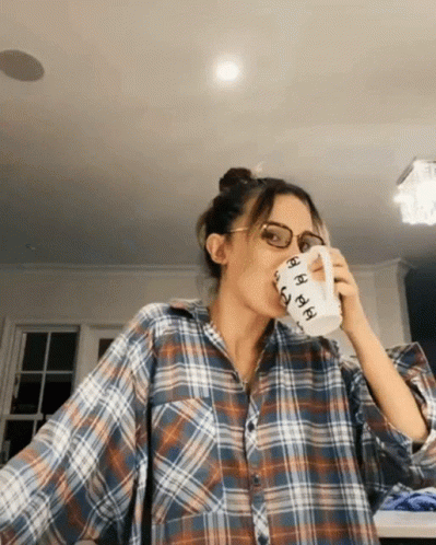 Millie Bobby Brown drinks from a mug and performs a fun dance in a plaid shirt for a TikTok video.
