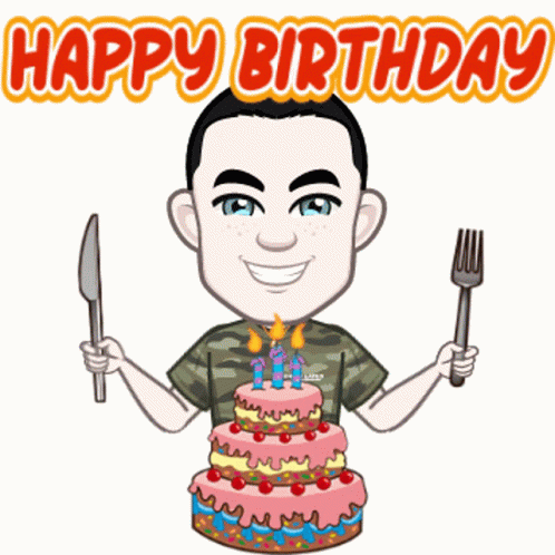 Millitar celebrates his birthday with a tiered cake, holding a knife and fork, ready to eat.