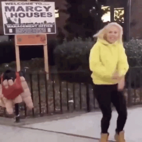 Woman in yellow hoodie performs the Milly Rock dance in front of the Marcy Houses management office.