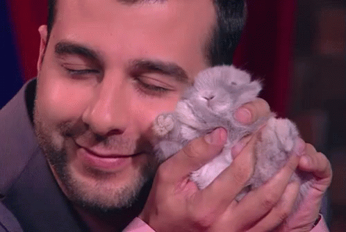Ivan Urgant gently holds and caresses a small, fluffy grey bunny.