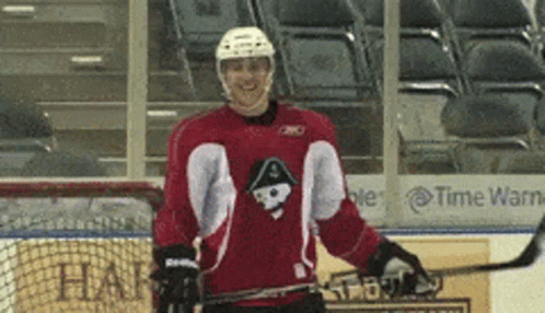 A Milwaukee Admirals hockey player in a red jersey smiles on the ice during a game or practice.