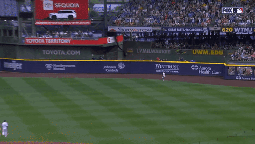 Milwaukee Brewers' Sal Frelick makes an impressive catch against the outfield wall during a baseball game.