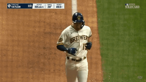Tyrone Taylor celebrates his powerful home run for the Milwaukee Brewers, hitting 403 feet.