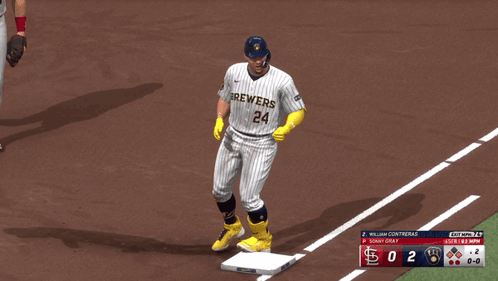 Milwaukee Brewers player William Contreras stands on base during an MLB game, with game stats visible.