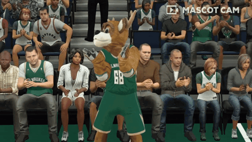 Milwaukee Bucks mascot Bango The Buck entertains the crowd with a dance, wearing jersey number 68.