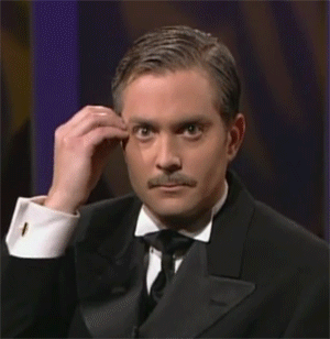 A man in a tuxedo and bow tie reacts with an expression of utter amazement, touching his head in disbelief.