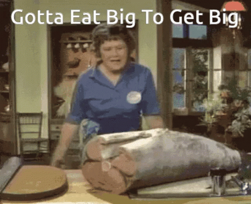 A woman stands with a massive piece of meat, with the viral meme text 'Gotta Eat Big To Get Big' displayed.