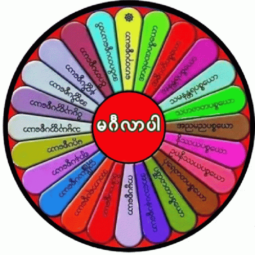 A colorful spinning wheel featuring Burmese text, with 'Hello' prominently displayed in the center.