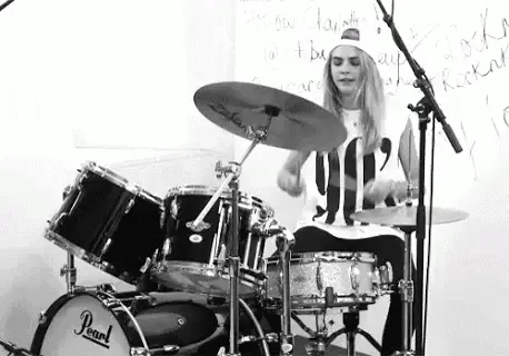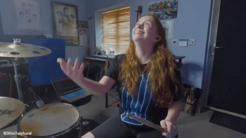 Mini Fairhurst showcases her drumming skills on a full drum set in a home studio.