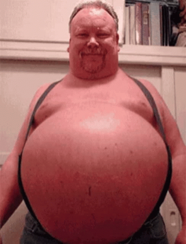 A smiling man with a huge belly humorously reveals a hidden minibar full of beer bottles.
