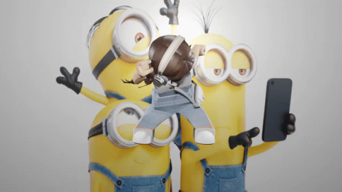 A Roblox-style avatar dances energetically in front of two Minions, one holding a phone, in a fun animation.