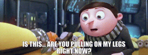 Gru from Minions: The Rise of Gru looks surprised, asking 'Are you pulling on my legs right now?'