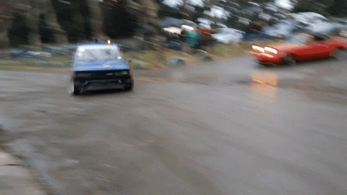 A blue minitruck performs drifts on a road, with a red car visible in the background.