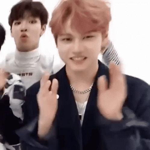 MCND's Song Minjae smiles brightly while making a heart shape with his hands, a popular K-pop gesture.