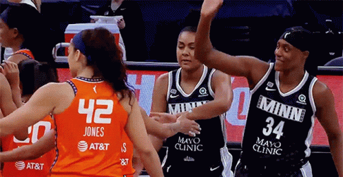 Minnesota Lynx player Damiris Dantas shares a shy high five with a teammate on the basketball court.