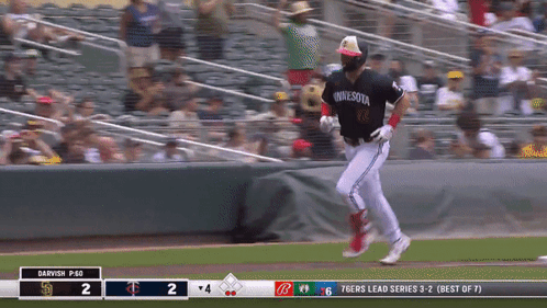 Minnesota Twins player Kyle Farmer celebrates a home run, running around the bases in a baseball game.