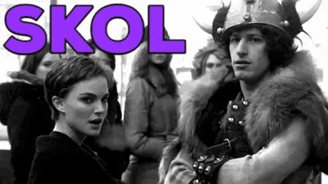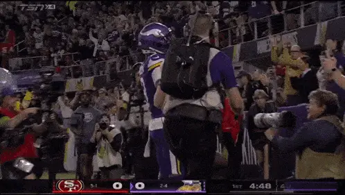 Paul Allen, wearing a Minnesota Vikings headband, passionately chants 'Skol Vikes!' in a dimly lit room.