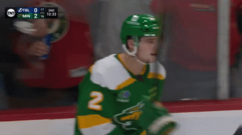Minnesota Wild player Calen Addison celebrates a goal with teammate Merrill during a hockey game.