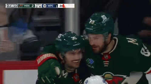 Frederick Gaudreau celebrates a goal with a teammate for the Minnesota Wild in an NHL game.