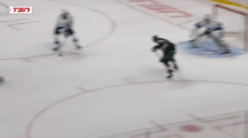 Jared Spurgeon (#46) scores a goal for the Minnesota Wild in an NHL hockey game, celebrating with Hartman (#39).