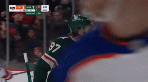 Kirill Kaprizov of the Minnesota Wild celebrates a goal with teammates during a hockey game.