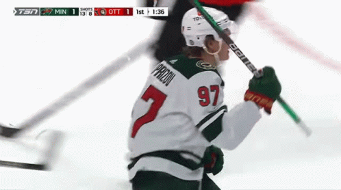 Kirill Kaprizov of the Minnesota Wild celebrates after scoring a goal in an NHL game.