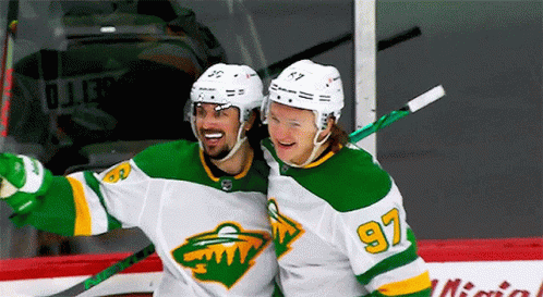 Kirill Kaprizov and a teammate celebrate a goal for the Minnesota Wild in their green and white uniforms.