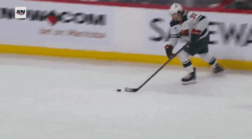 Ryan Hartman of the Minnesota Wild skates with the puck, evades a defender, and shoots towards the net during an NHL game.