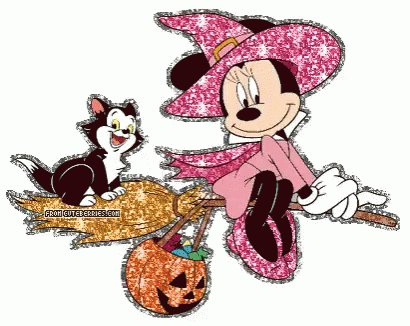 Minnie Mouse flies on a broomstick with a cat, sparkling with glitter, in a Halloween scene.