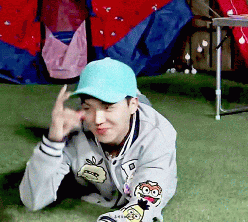 Song Mino lies on the grass, wearing a blue hat and gray jacket, making a playful face.