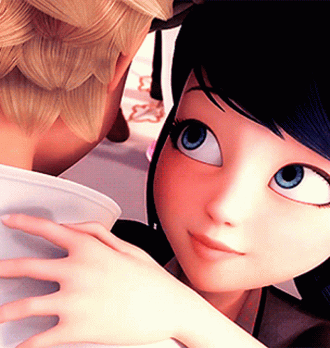 A tender close-up of Marinette and Adrien, the Adrienette couple from Miraculous Ladybug, sharing a heartfelt hug.