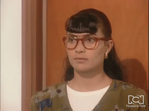 Ana Maria Orozco as Betty La Fea, wearing glasses and looking worried, with the RCN Nuestra Tele logo.