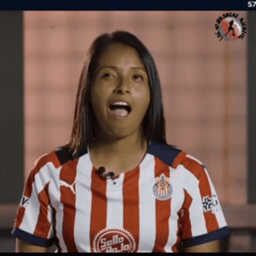 Miriam Castillo, a Chivas Femenil player, smiles while wearing her red and white striped Rojiblancas jersey.