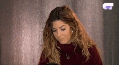 Miriam intently reading text messages on her phone, wearing a maroon turtleneck sweater indoors.